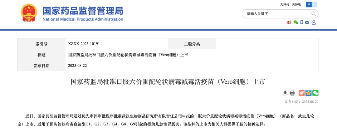 近日,國藥集團中國生物武漢生物制品研究所研制的口服六價重配輪狀病毒減毒活疫苗(Vero細胞)(商品名:武生兒輪寶®)正式獲得國家藥品監(jiān)督管理局批準上市。該產(chǎn)品是全球首款、價次最高的輪狀病毒疫苗,為我國預(yù)防用生物制品1類新藥,主要用于預(yù)防輪狀病毒引起的嬰幼兒急性胃腸炎。