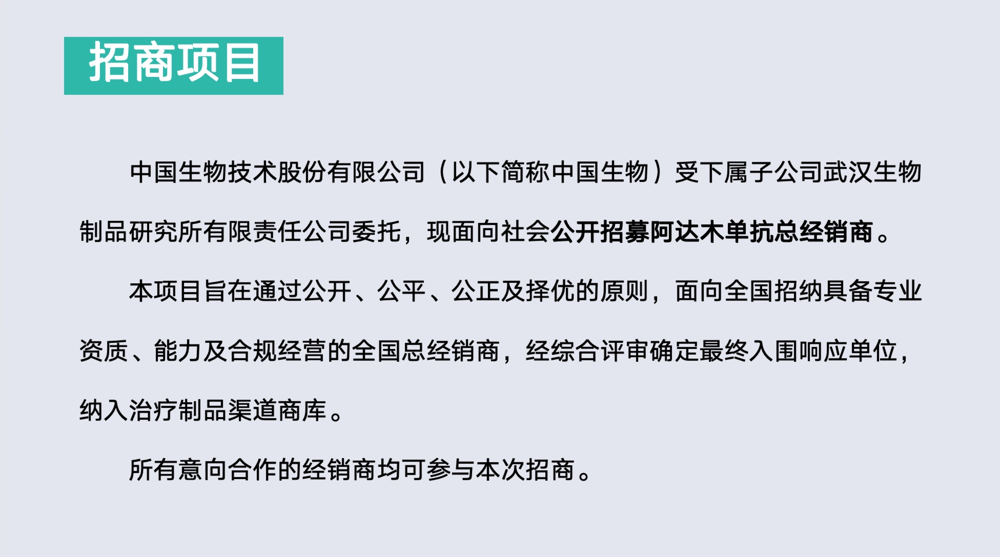【招商公告】中國生物技術(shù)股份有限公司2025至2028年阿達木單抗總經(jīng)銷商招商公告