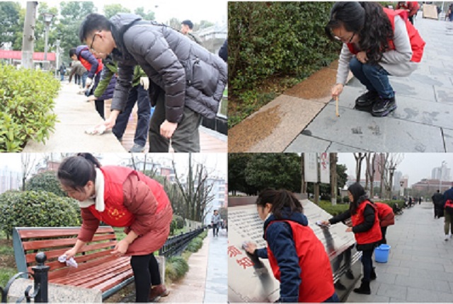 下午,活動參與人員統(tǒng)一志愿者服裝著裝,集體前往武昌首義廣場。根據安排,志愿者們分成若干小組,拿出提前準備好的清潔工具迅速投入到廣場的清潔中。桌椅清潔、地面打掃、垃圾分類、擺正路標,大家分工合作,干勁十足,不放過任何死角,對廣場周邊公共設施進行了全面清潔,給游客及周邊居民提供一個良好的廣場環(huán)境。